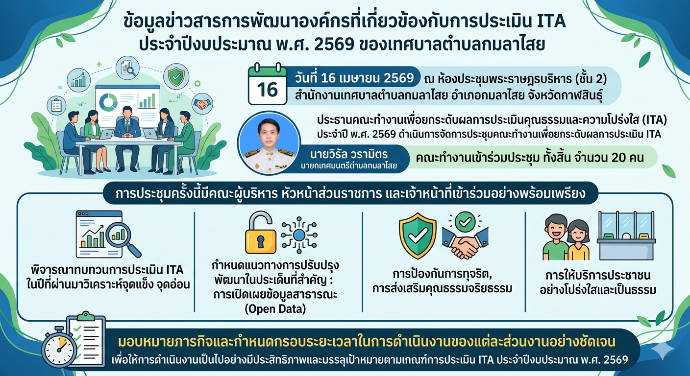 เมื่อวันที่ 16 เมษายน 2569 เทศบาลตำบลกมลาไสย อำเภอกมลาไสย จังหวัดกาฬสินธุ์ โดย นายวิรัล วรามิตร นายกเทศมนตรีตำบลกมลาไสย ประธานคณะทำงานเพื่อยกระดับผลการประเมินคุณธรรมและความโปร่งใส ในการดำเนินงานของเทศบาลตำบลกมลาไสย ITA ประจำปีงบประมาณ พ.ศ. 2569 ได้ดำเนินการจัดการประชุมคณะทำงานเพื่อยกระดับผลการประเมิน ITA ของเทศบาลตำบลกมลาไสย ประจำปีงบประมาณ พ.ศ. 2569 ขึ้น ณ ห้องประชุมพระราษฎรบริหาร (ชั้น 2) สำนักงานเทศบาลตำบลกมลาไสย อำเภอกมลาไสย จังหวัดกาฬสินธุ์ โดยมีคณะทำงานที่ได้รับการแต่งตั้งตามคำสั่งเข้าร่วมประชุม ทั้งสิ้น จำนวน 20 คน